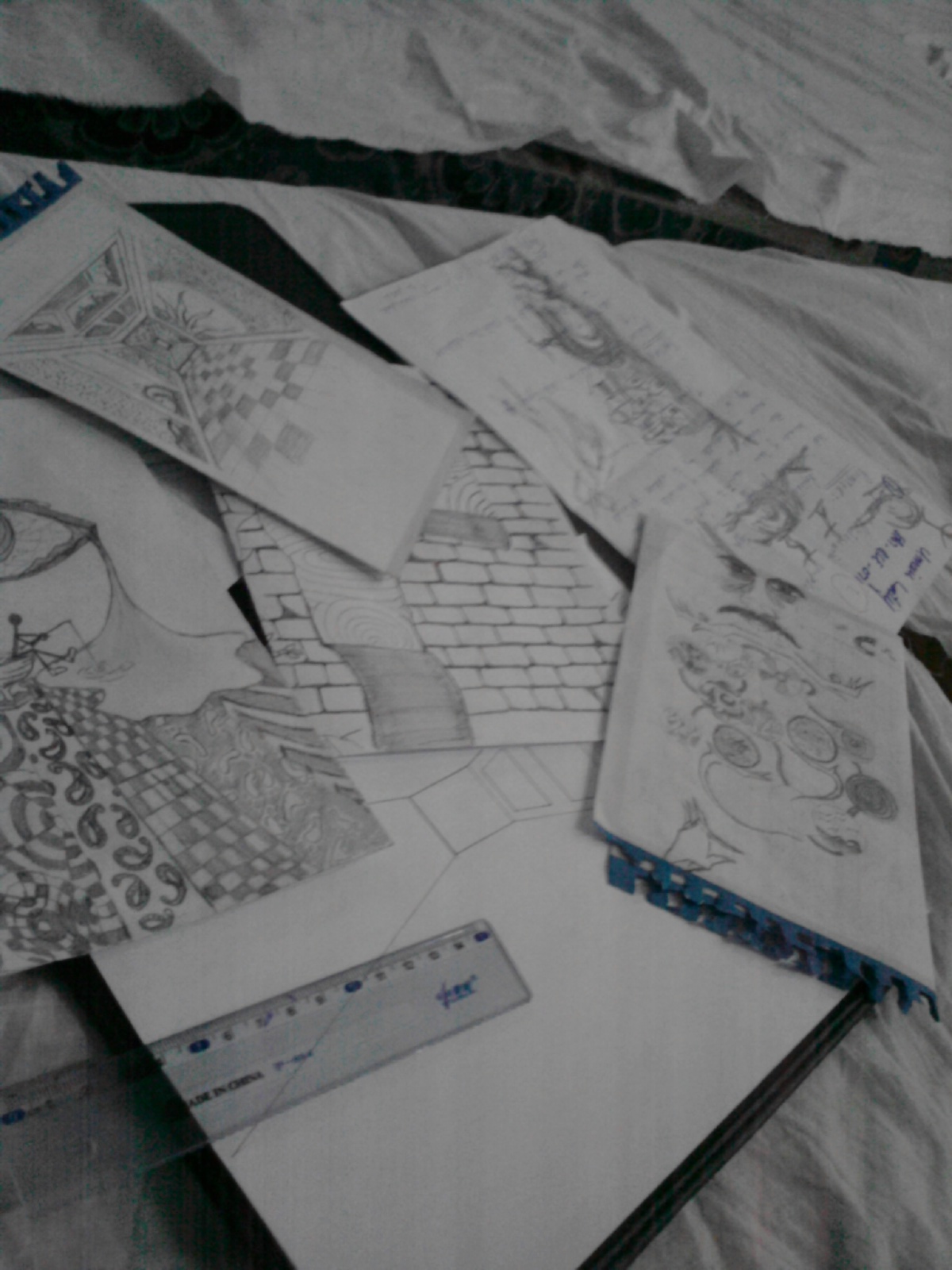میرے اصل “کچ مچوڑے” ردی کی صورت میں گھر پڑی کتابوں کاپیوں میں ہیں، اور کالج کے زمانے کے صفحوں پر تو میں نے وہ تباہی پھیری ہوئی ہے’ آرٹ‘ کی کہ بس۔۔۔ ایف ایس سی کی اردو کی کتاب میں تو میں نے اپنی لیکچر دیتی ہوئی قابل صد احترام استانی صاحبہ کا پورٹریٹ بھی بنایا ہوا ہے۔ امتحانوں میں تو فنونِ لطیفہ و غیر لطیفہ میرے سر پہ سوار ہوتے ہیں۔ پڑھتے پڑھتے ہی کئی ڈوڈل میری قلم کی گود سے جنم لیتے رہتے ہیں۔(ایک الگ پوسٹ میں نمائش کیلئے ضرور شائع کروں گا!)