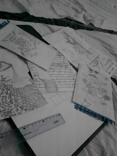 اب یہ نیچے والے ڈوڈل اصل میں مقابلے کیلئے بنائے گئے تھے۔ ان میں میں نے ایک رنگ دار پنسلوں سے، ایک سیاہ مارکر سے اور ایک کچی پنسل سے بنایا ہے۔